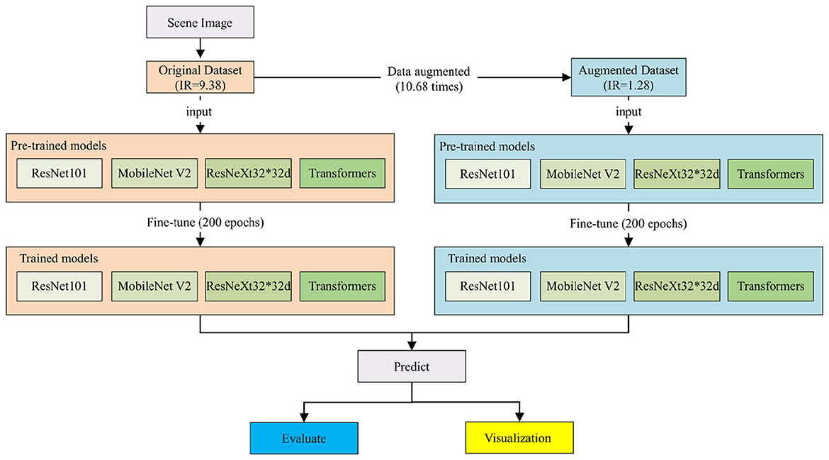 Figure 1 illustrates the experimental workflow. First, a class-imbalanced high-resolution remote sensing scene image dataset is constructed. Second, comprehensive data augmentation methods are applied according to dataset characteristics, reducing the dataset's imbalance ratio (IR) by approximately one-seventh. Subsequently, the classifiers are trained and fine-tuned on both augmented and original datasets. Finally, model performance on overall and individual categories is evaluated, with visualization of results from selected study areas.