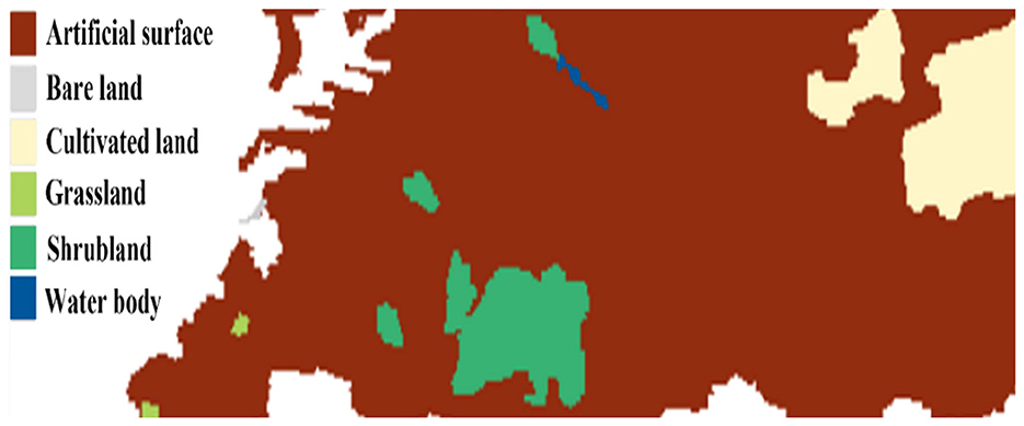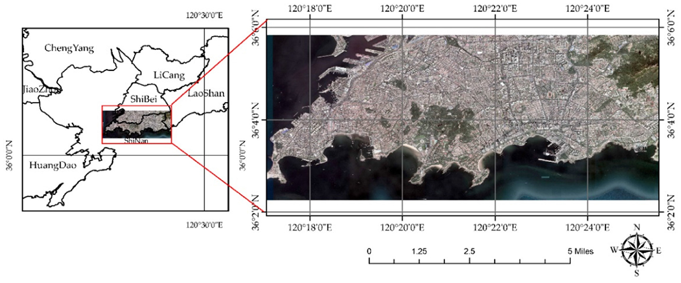 Shinan district is located in the southern area of Qingdao, Shandong province, characterized by a compact north–south extent of 4.5 km and an elongated east-west span of 12.7 km, with a total area of 30.01 km2 and approximately 15 km of coastline. The study region encompasses Shinan district and its surrounding areas (including marine regions), ranging from 120.2793229°E to 120.4292515°E and from 36.0376721°N to 36.0973352°N (Figure 2). Based on the data from the National Geomatics Center of China, the 30-m LULC of Shinan District and its surrounding areas is presented as shown in Figure 3. Combining Figures 2, 3, the main LULC of the study region includes water bodies (not including the ocean), artificial surfaces, shrubland, cultivated land, grassland, and bare land. The artificial surface category exhibits complex sub-classifications, encompassing buildings of different heights, roads, and open-air venues. This diversity makes the region particularly suitable for RSSC research. Furthermore, as the study region represents a typical urban built-up area, accurate scene classification is essential for understanding urban spatial distribution patterns through semantic analysis of scene images.