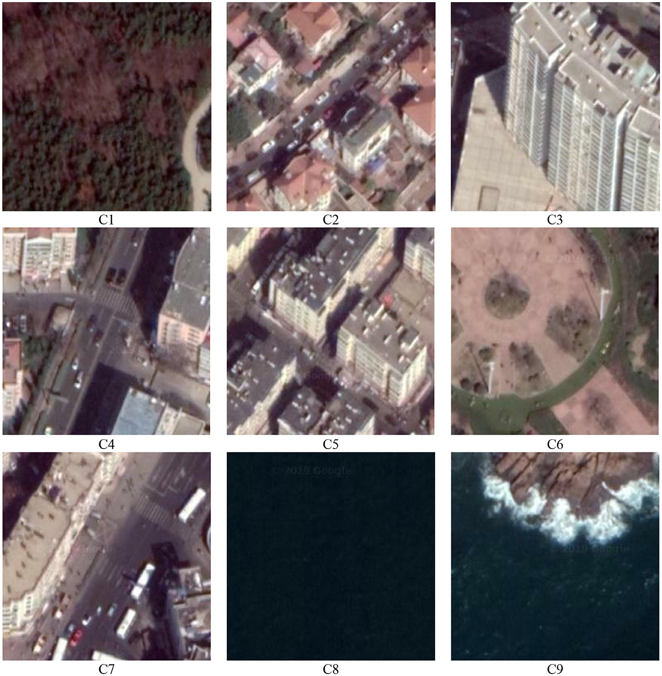 Figure 4. Examples of each class are shown, where C1–C9 represent chaparral, dense buildings, high-rise sparse buildings, low-rise sparse buildings, intersections, open-air venues, roads, water, and coastline, respectively.