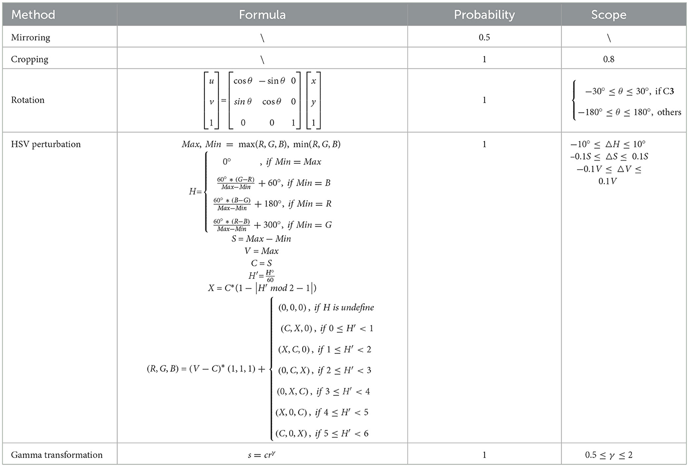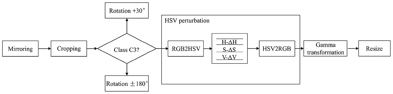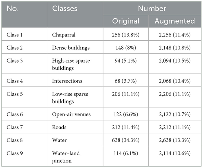Subsequently, augmentation methods were applied to each sample based on its calculated multiple (Figure 5), encompassing mirroring, rotation, cropping, hue, saturation, and value (HSV) perturbation, and gamma transformation (Shi et al., 2020; Lewis et al., 1989). Augmentation parameters were determined through empirical validation on subsets of each class to ensure semantic consistency and optimal performance. Specifically, the mirroring probability was set to 0.5, while all other techniques were applied with a probability of 1.0. For rotation operations, class-specific parameter ranges were implemented: C3 (high-rise sparse buildings) was limited to ±30° to preserve architectural orientation and geometric relationships, while other classes utilized the full ±180° range. During rotation, additional cropping was used to eliminate edge artifacts. Given the slight deviation of the central axis from the vertical in bird's-eye view imagery, the perturbation ranges for HSV components were adjusted according to class characteristics: C8 (water) received reduced perturbation ranges (±5°, ±5%, ±5%) to maintain its distinctive spectral signature, while other classes used standard ranges of ±10°, ±10%, and ±10% for H, S, and V components, respectively. For structured categories such as C4 (intersections) and C7 (roads), stricter cropping boundaries were enforced to prevent semantic category shifts during spatial augmentation. The γ value for the gamma transformation was set in the range 0.5–2. Due to the size alterations induced by augmentation operations, a resizing step was incorporated to ensure compatibility with the classifier's input requirements. Finally, the augmented dataset was constructed by merging the augmented samples of each category with the original dataset (Table 3).