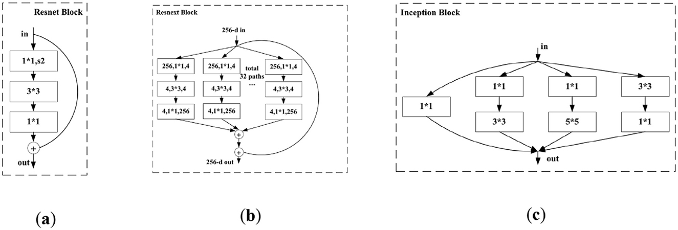 ResNeXt (Xie et al., 2017) simplifies the “split–transform–merge” structure of the Inception block (Szegedy et al., 2015) (Figure 7c) into a uniform topological structure. By combining this approach with Resnet's shortcut connections (He et al., 2016), ResNeXt introduces grouped convolution, which represents an intermediate architecture between ordinary convolution and depth-wise separable convolution, achieving improved computational efficiency. When the dimension of the input feature map is 256, the ResNeXt block uses 32 groups of independent convolutions with identical topology (Figure 7b).