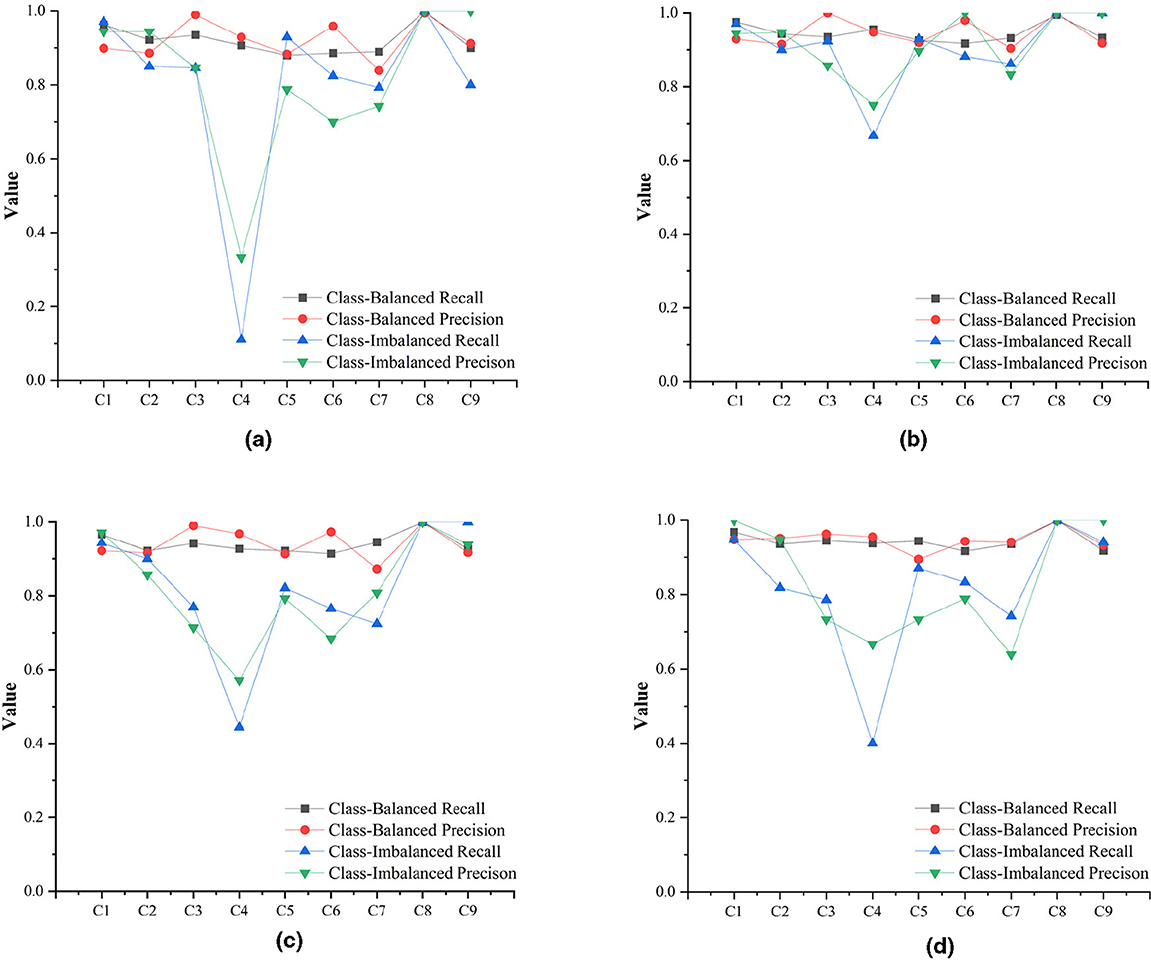 Figure 8. Precision and recall of each category in the three models. (a) MobileNetv2. (b) ResNet101. (c) ResNeXt32*32d. (d) Transformer.