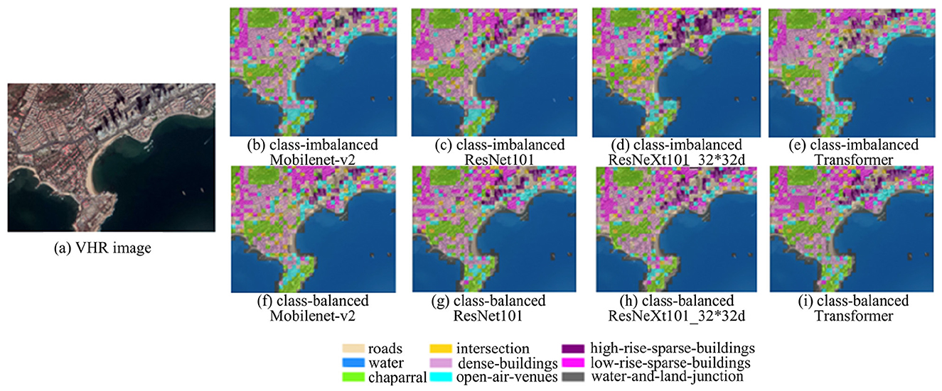 Figure 9. Partial visualization results of the models with the classification legend. (a) is VHR image, (b–e) are Mobilenet-v2, ResNet 101, ResNeXt101_32*32d, Transformer results under class-imbalanced respectively, (f–i) are Mobilenet-v2, ResNet 101, ResNeXt101_32*32d, Transformer results under class-balanced respectively.
