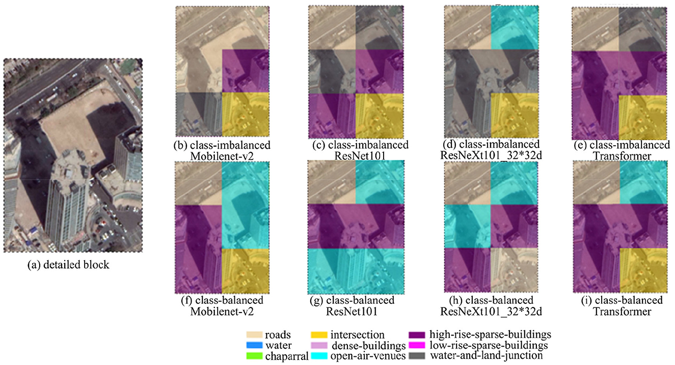 Figure 10. Partial visualization results of the models for the detailed block with a classification legend. (a) is detailed block image, (b–e) are Mobilenet-v2, ResNet 101, ResNeXt101_32*32d, Transformer results under class-imbalanced respectively, (f–i) are Mobilenet-v2, ResNet 101, ResNeXt101_32*32d, Transformer results under class-balanced respectively.