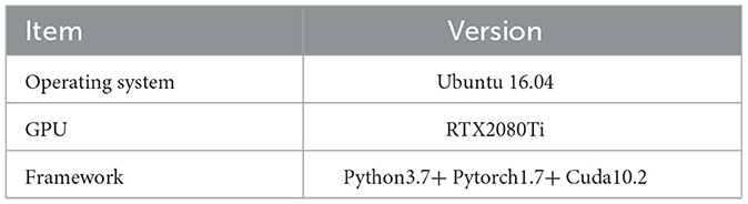 The experiments were performed on a server configured with Ubuntu 16.04, a GPU (RTX2080Ti), and the Cuda10.2 + Python3.7 + Pytorch1.7 framework, as detailed in Table 5.