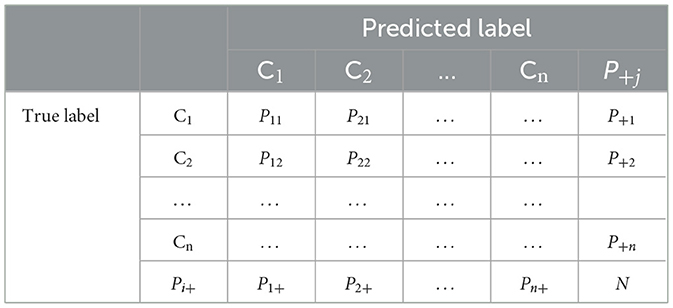 In this study, Kappa, recall, precision, and OA were used as the evaluation metrics, with the means of recall and precision values calculated for each category. Recall represents the probability that positive samples from a specific category are correctly classified, while precision represents the probability that samples predicted as belonging to a particular category are actually correctly classified. OA represents the proportion of correctly classified samples relative to the total sample count, and the Kappa measures the agreement between predicted and true labels, accounting for chance agreement. Table 6 presents a typical confusion matrix, with Kappa, precision, recall, and OA computed according to Equations 2–5.