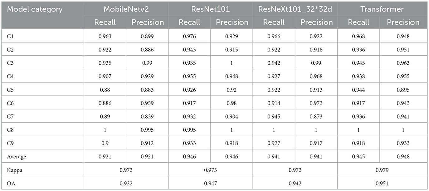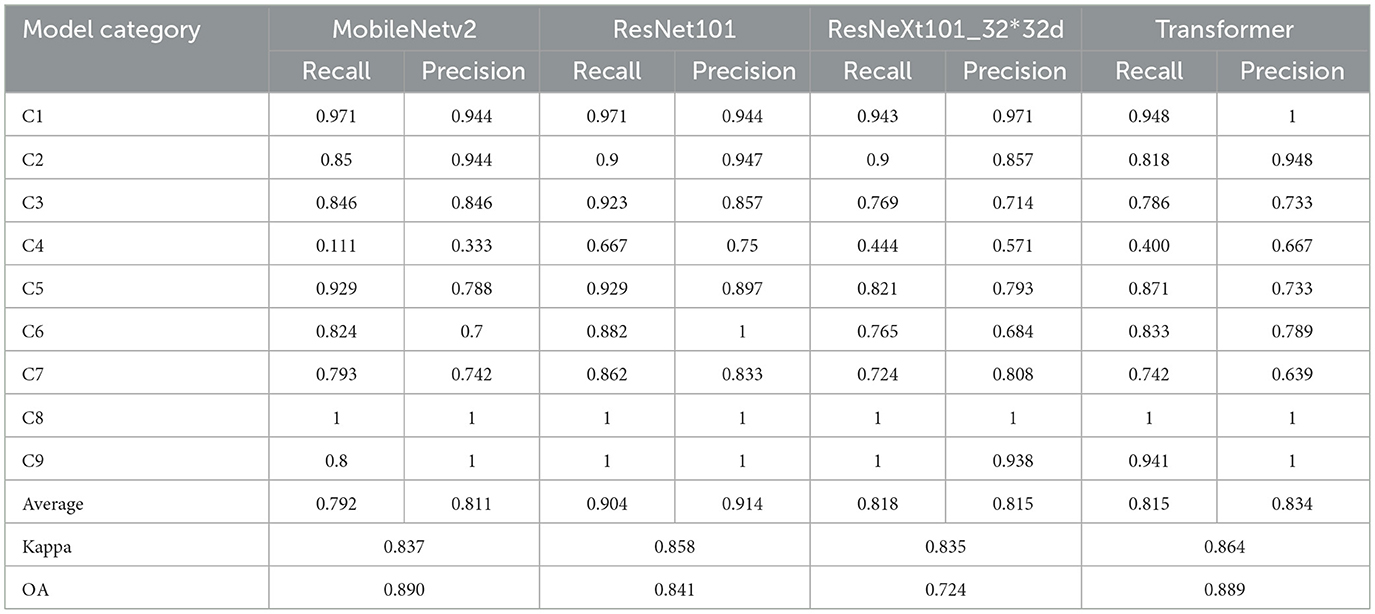 The C4 category exhibited obvious classification bias (Figure 8) due to its severely limited representation. Among conventional CNN architectures, ResNet101 showed the smallest performance gap for C4 relative to other categories. However, the Transformer architecture demonstrated superior robustness to class imbalance, maintaining more consistent performance across all categories. Conversely, C8 (water), with the highest proportion (0.343, 638/1,858) in the class-imbalanced dataset, achieved near-perfect performance (approaching or reaching 100% recall and precision) across all models. The overall accuracy indicators OA and kappa do not adequately represent individual class performance, particularly for minority classes. The performance ranking based on average recall and precision across categories follows: Transformer > ResNet101 > ResNeXt101_32 × 32d > MobileNet-v2, though this hierarchy is not reflected in the overall OA and Kappa metrics.