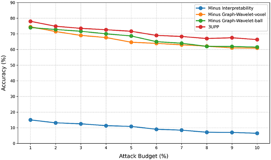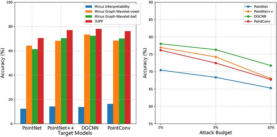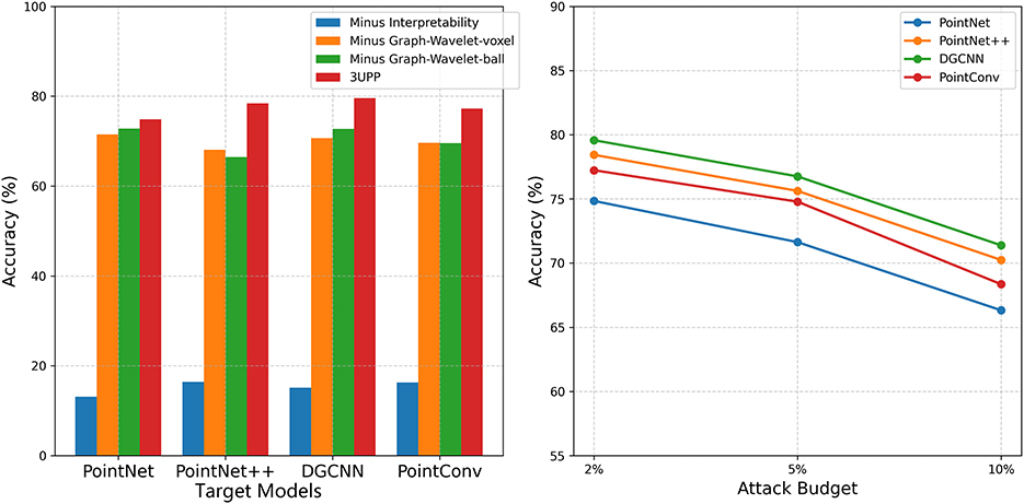 Figure 2. Ablation comparison and robustness analysis on the ModelNet40 with different attack budgets.
