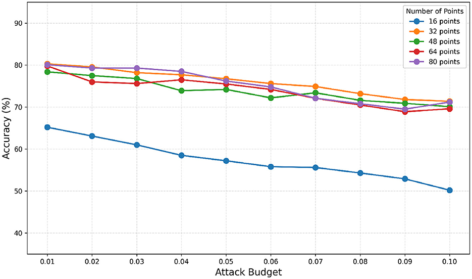 Further testing against the PointNet model on ModelNet40, as shown in Figure 4, demonstrates that increasing the attack budget leads to increased perturbation strength, making the samples more vulnerable to attacks. Consequently, the effectiveness of the defense method decreases as the attack budget increases.