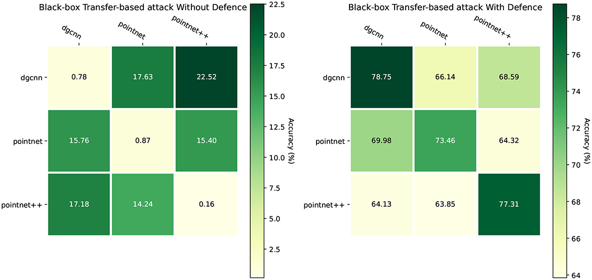 The left heatmap demonstrates the severe vulnerability of undefended models, where transfer attacks prove highly effective. The remaining classification accuracies are drastically reduced, consistently falling below 23% and often dropping to below 1% when the source and target model architectures are identical (e.g., 0.16% for PointNet++). This establishes a critical baseline, highlighting the insecurity of standard models. In stark contrast, the right heatmap reveals a dramatic improvement in model resilience upon applying our defense. The defended models consistently maintain high accuracy, with the lowest post-attack accuracy being 63.85%. Notably, accuracies on the diagonal, such as 78.75% for DGCNN and 77.31% for PointNet++, are significantly restored, showcasing the defense's strength even when the adversary has implicit knowledge of the model's architecture. This substantial elevation in performance across all source-target pairs confirms that our method provides robust protection, effectively neutralizing the threat of transfer-based attacks in a black-box setting.