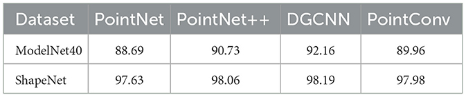 This study evaluates the proposed method using two publicly available datasets: ModelNet40 and ShapeNet. The ModelNet40 dataset comprises 12,311 CAD models categorized into 40 distinct object classes. These models are partitioned into a training set containing 9,843 samples and a test set with 2,468 samples. Covering a diverse range of domains including furniture, vehicles, and animals, the dataset provides both raw 3D mesh models and pre-processed point cloud representations, facilitating their use in various 3D analysis tasks.