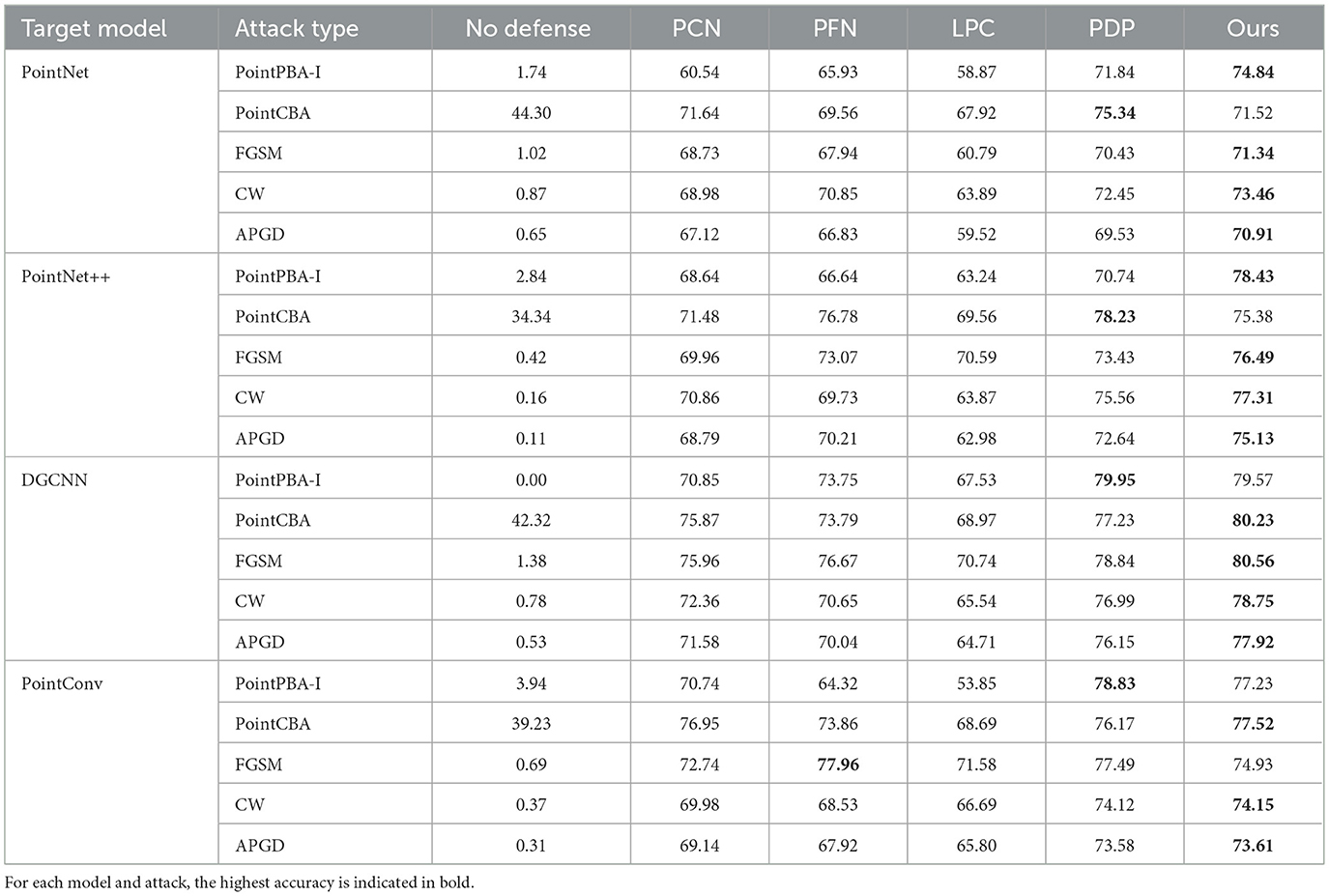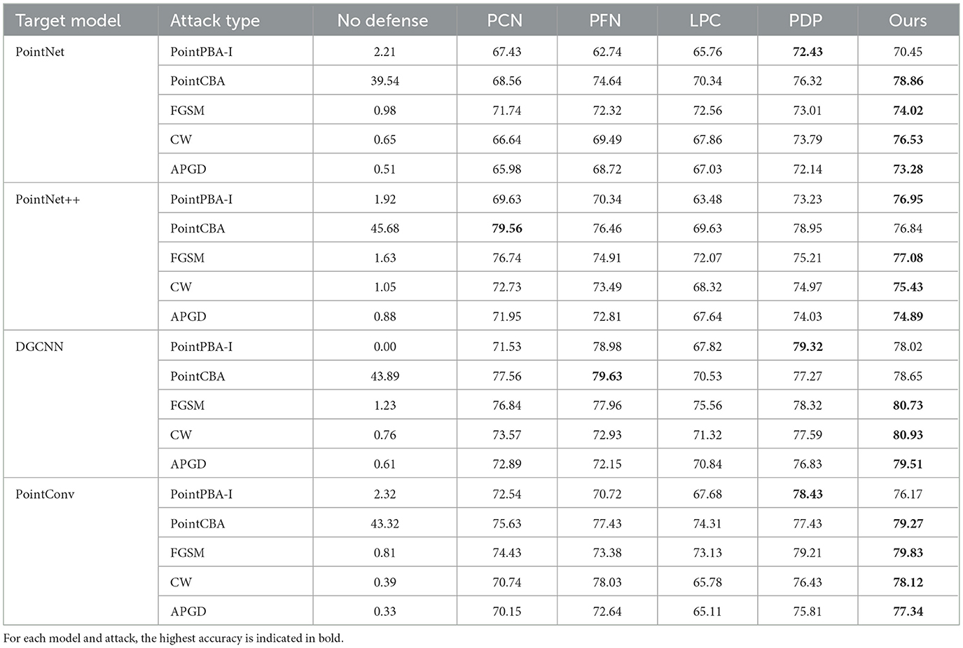 To provide a comprehensive comparison, we selected four state-of-the-art 3D point cloud denoising methods as baselines: PointCleanNet (PCN) (Rachmiel and Bruckstein, 2020), PointFilterNet (PFN) (Yuan et al., 2020), LPC (Implicit Gradient Defense) (Pang et al., 2020), and PointDP (Point Diffusion Purification) (Luo et al., 2021). For conciseness, these methods are denoted as PCN, PFN, LPC, and PDP, respectively.
