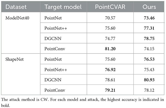 For experiments requiring a fixed-size input, 1024 points were uniformly sampled from the original point cloud data. As shown in Table 1, this study employs four widely-used 3D deep learning classifiers as victim models: PointNet (Qi et al., 2017a), PointNet++ (Qi et al., 2017b), DGCNN (Wang et al., 2019), and PointConv (Wu et al., 2019).
