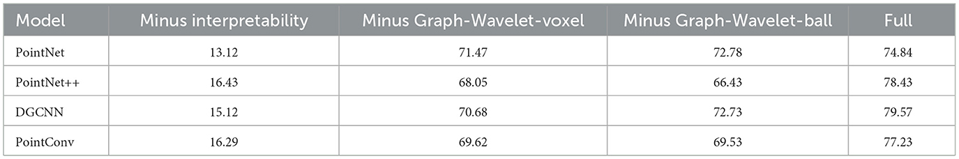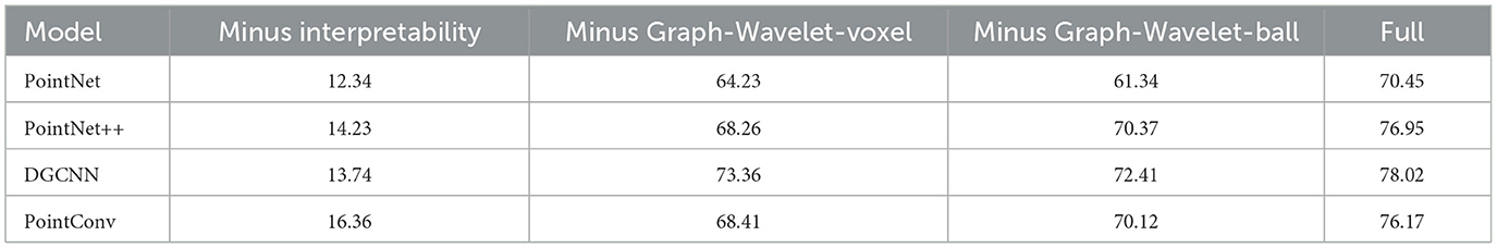 As shown in Tables 5, 6, the results for the control group (our full method) demonstrate that removing the model's interpretability significantly reduces the classification accuracy of the purified samples. This finding strongly suggests that model interpretability plays a crucial role in enhancing the defense effect against universal 3D point cloud perturbations. Additionally, when the continuous curvature segment extraction module is removed (using either voxel or Ball Query replacements), the model's classification accuracy also decreases, albeit to a lesser extent than when the model interpretability is removed entirely. The performance degradation in “Minus Graph-Wavelet-voxel” and “Minus Graph-Wavelet-ball” settings is less pronounced compared to “Minus Interpretability”.