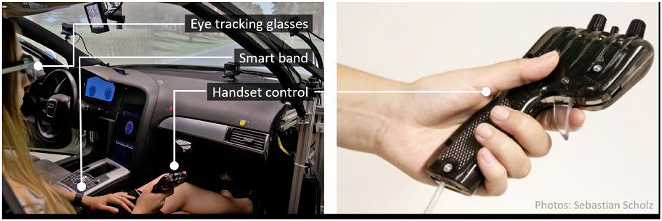 Figure 1. Driving simulator with sensor setup for discomfort assessment (left); including handset control as an experimental tool for continuous discomfort feedback during fully automated driving (right).