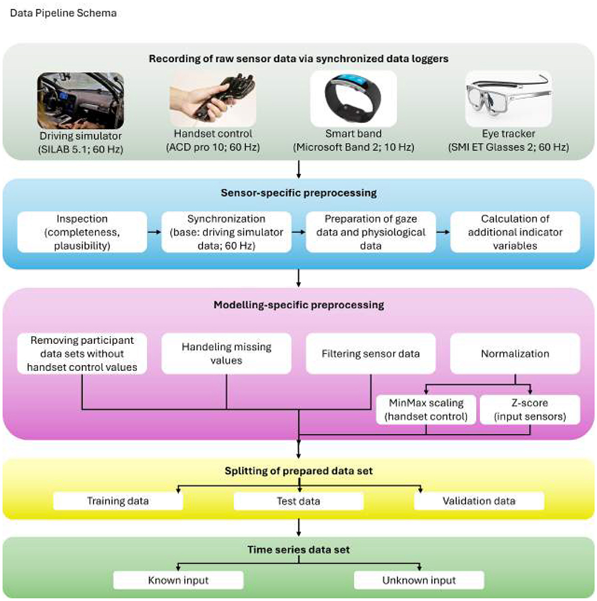 Figure 2. Overview of the data preprocessing pipeline. All sensors are shown, including eye tracking, smart band, and simulator signals, followed by preprocessing and preparation of data for time-series forecasting models.