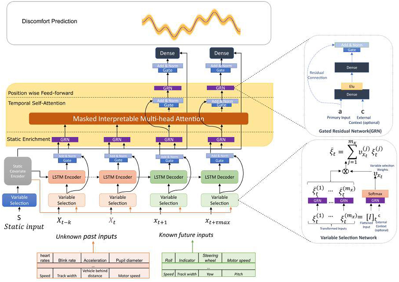 To match an automated driving experience in a real environment, we intentionally exclude the use of past discomfort outputs, yi, tk:t, as the input signal. This decision is based on the knowledge that discomfort cannot be directly measured in real-world scenarios. Our method, therefore, does not have autoregression, which is the process of predicting the future value of a time series given its past values. Rather, our model is based on a sequence-to-sequence framework, where the model takes a sequence of past sensor signals as input and estimates a sequence of future predictions as output. We do not give the target value (discomfort) as an input signal to the model, because it is necessary to prevent any information leakage from the target into the input sequence. By avoiding the use of auto-regression and carefully picking the input and output sequences, we can ensure that our model is accurate and robust for predicting future values of the output sequence. Multi-head attention is a strong element in TFT that allows models to focus on different parts of the input signal when making predictions. It is like having multiple sets of perspectives, and each explores a different aspect of the data, which is especially useful for capturing complex patterns from the data.