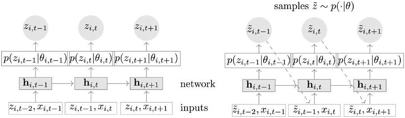 Diagram of the DeepAR model. On the left, network inputs include covariates x_{i,t}, target values z_{i,t}, and past outputs h_{i,t-1}. These feed into recurrent layers h_{i,t-1}, h_{i,t}, h_{i,t+1} whose outputs are used to compute parameters {i,t}for the conditional probabilities . On the right, during prediction, sample estimates are generated and connected by dashed arrows, showing how predicted values are fed back as inputs for future steps.