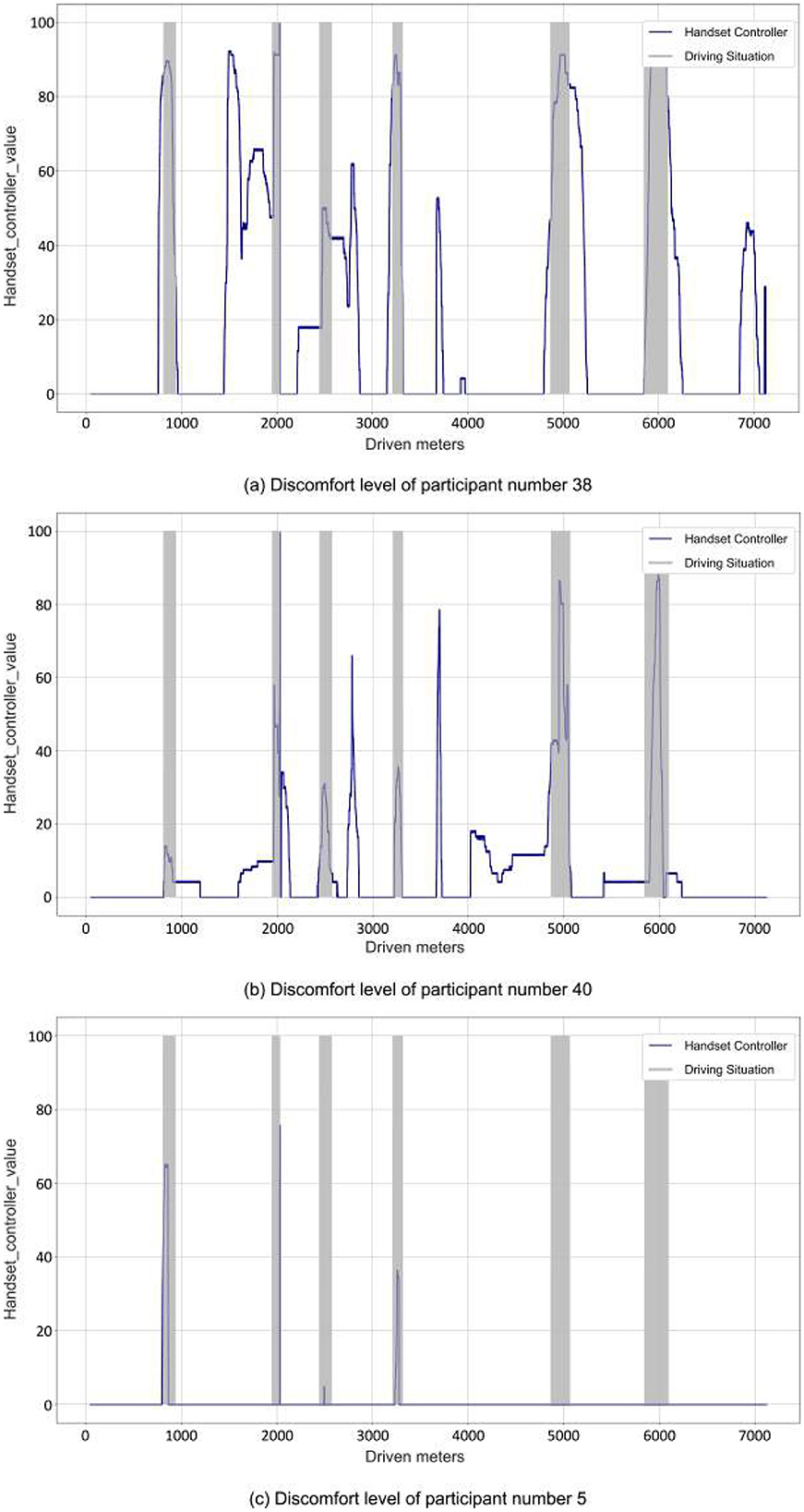 Figure 5. Handset controller values (discomfort levels) of three random participants. (a–c) Correspond to these different random participants and illustrate their levels of discomfort in an identical scenario. The gray-shaded area represents complex and, therefore, potentially discomfort-inducing driving conditions, such as traffic lights or lane changes.