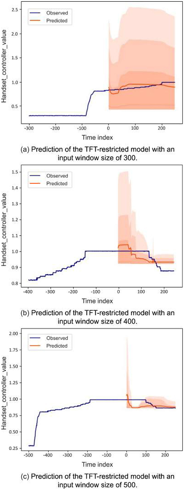Three line graphs illustrate predictions of a TFT-restricted model with different input window sizes. (a) Window size 300: The predicted (orange) line tracks the observed (blue) values most closely, but the prediction interval is wide with broad shading. (b) Window size 400: Shaded uncertainty is narrower than (a); however, the predicted line deviates more from the observed trajectory around and after the prediction time. (c) Window size 500: Uncertainty bands are the narrowest, yet the predicted line, yet the predicted line shows larger bias. All panels plot the handset controller value versus time index.