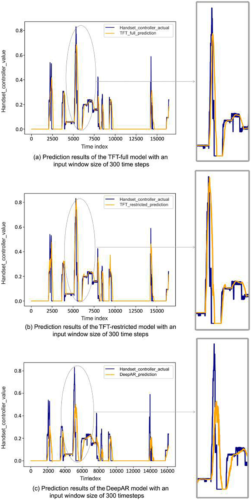 Graph panels compare the prediction results of three models: TFT-full, TFT-restricted, and DeepAR. Each panel shows actual handset controller values versus predicted values, using a window size of three hundred time steps. Annotations highlight specific segments of the data where predictions and actual values are closely evaluated. Each graph has a zoomed-in section for detailed analysis.