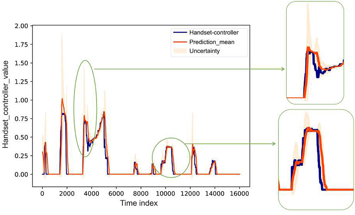 Line chart depicting handset controller values over time, with prediction mean and uncertainty bands. Two specific sections are magnified on the right, highlighting periods of high uncertainty where prediction and actual handset values diverge.
