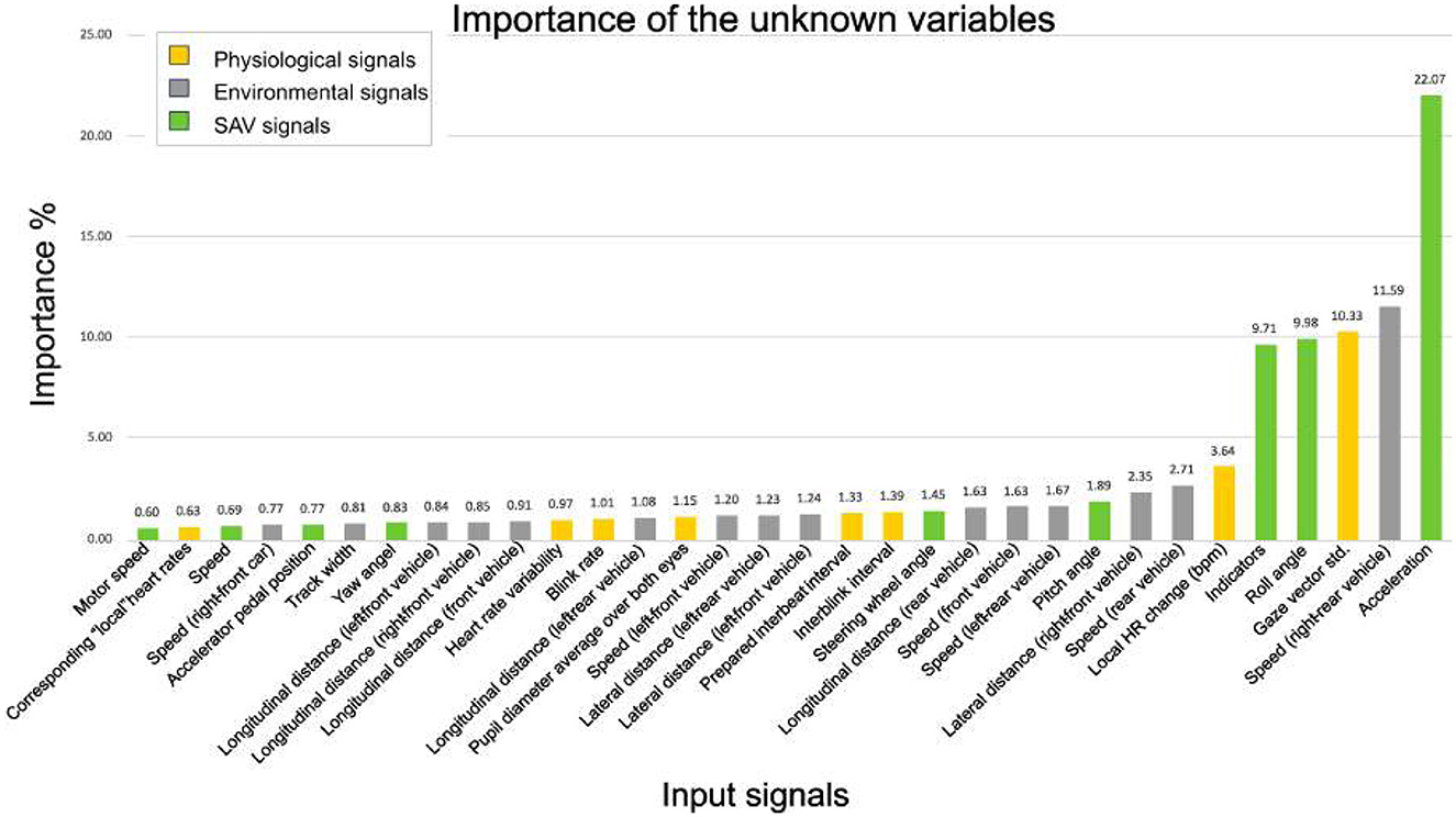 Bar chart titled Importance of the unknown variables showing various input signals on the x-axis, such as acceleration, speed, and heart rate, with their importance percentage on the y-axis. Signals are categorized into physiological (yellow), environmental (gray), and SAV signals (green). Acceleration has the highest importance at 22.07 percent. Other notable variables include speed (right rear vehicle) and roll angle.