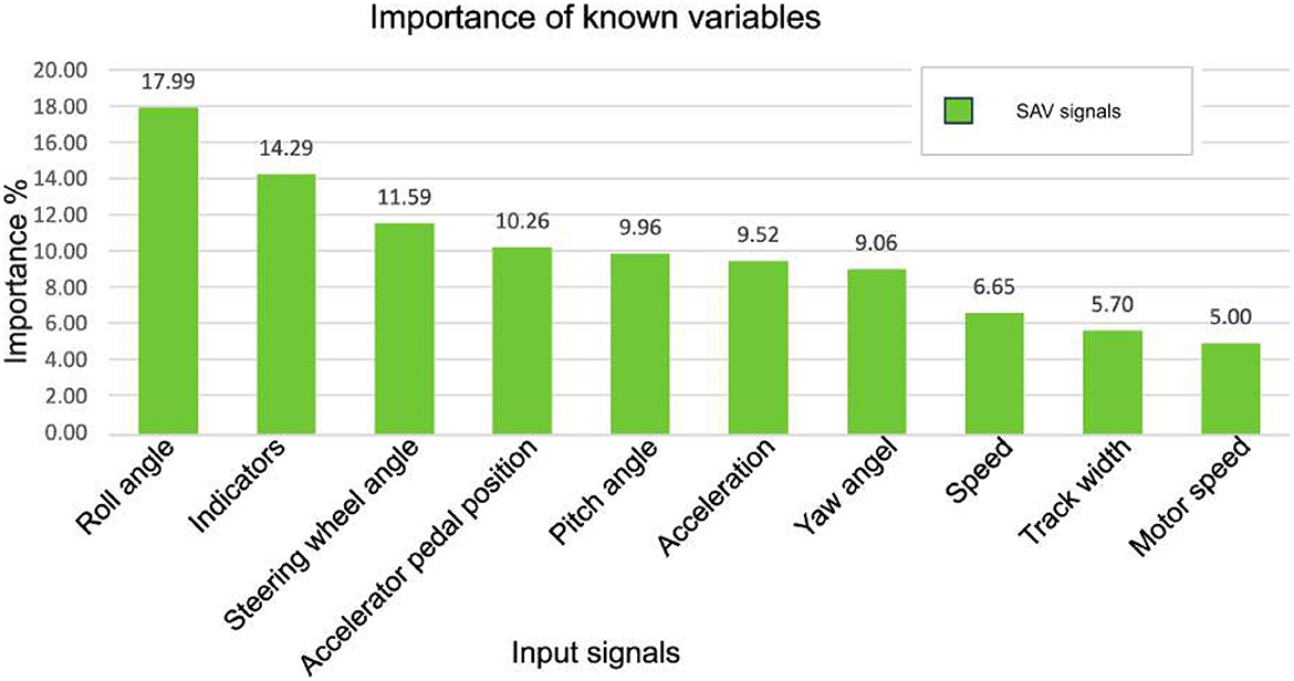 Bar chart titled Importance of known variables showing percentages of importance for various input signals. Roll angle is highest at 17.99%, followed by indicators at 14.29%, and motor speed is lowest at 5.00%. Signals include steering wheel angle, accelerator pedal position, pitch angle, acceleration, yaw angle, speed, track width, and motor speed, all represented as green bars labeled SAV signals.