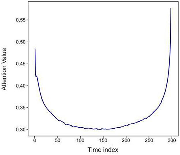 Figure 13. Visualizing attention weight patterns in TFT-Restricted with a 300-time step input window size. This visualization contains the entire test set, highlighting the importance of both the beginning and end of the input sequence.