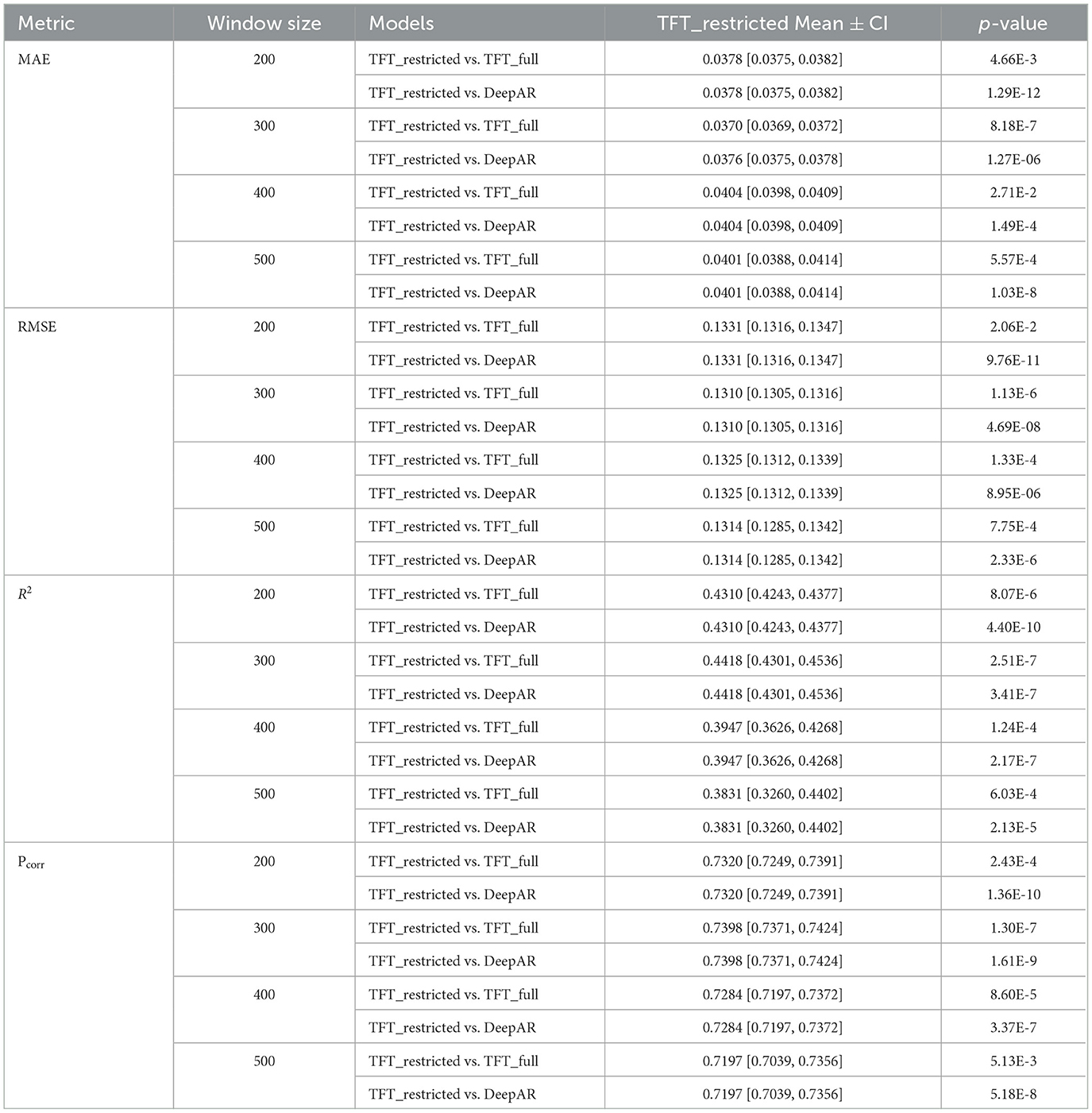 The MAE and RMSE metrics are utilized to evaluate the error level between the predicted and actual results. Lower values of these metrics indicate higher forecasting performance. The coefficient of determination R2 compares the variance of the residual error to the variance of the target sequence around its temporal average Et[y]. The particular benefit of R2 is that it provides a normalized measure of how well the predictions explain the variability of the actual data. A coefficient of determination equal to 1 denotes that the predictions perfectly fit the data. The Pcorr, calculated using the covariance Cov() and standard deviation std() functions, represents the strength of the linear relationship between the target and predicted signals, ranging from –1 to 1. An absolute value of 1 indicates a perfect relationship between the target and the predicted signal. It is mainly useful for assessing the linear relationship between the target values and the predicted signal. TFT training involves a joint minimization of the quantile loss, as described in (Wen et al. 2017), which is aggregated across all quantile outputs. To achieve quantile predictions, the Quantile Loss (QL) is explicitly formulated for each quantile q as follows: