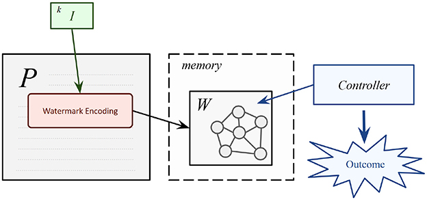 After P is executed, the Controller, considered an external application, accesses the memory and tries to detect W from it. Finally, a secret code computed using the detected watermark is compared with the one expected to be generated for the correct input, and a final assessment is provided regarding the integrity and authenticity of I.