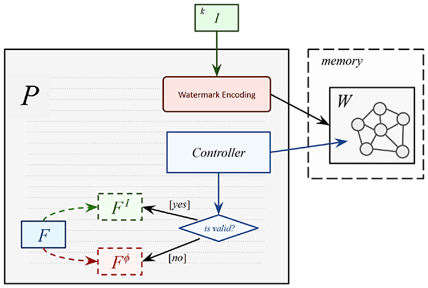 The architecture of the approach proposed in this work is built based on dynamic data structure watermarking. In this case, the Controller is embedded in the program P as scattered and obfuscated code. Since the main goal is to validate I for the function F, P can be stored and deployed in a more secure environment. Nevertheless, this is not a requirement.