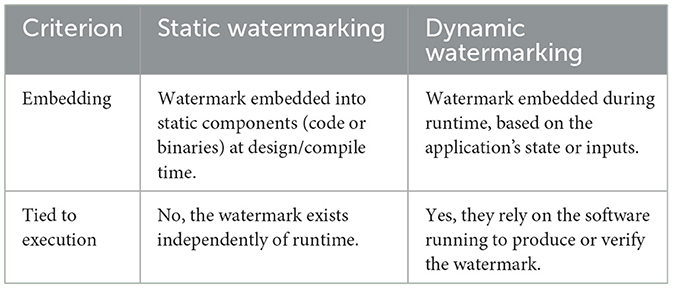Software watermarking techniques can be classified into two categories: static and dynamic. Static techniques embed the watermark directly into the software's static artifacts, such as its source code, compiled binary, data files, or the application executable itself. There, the watermark remains as part of the software regardless of whether it is running or not. On the other hand, dynamic watermarking techniques store the watermark in the program execution state (Wu et al., 2024). Dynamic watermarks can be processed, verified, or executed during the runtime of the software or application. They are tied to the behavior or state of the application as it operates (Pieprzyk, 1999; Dey et al., 2019). Table 1 resumes the differences between dynamic and static software watermarking.