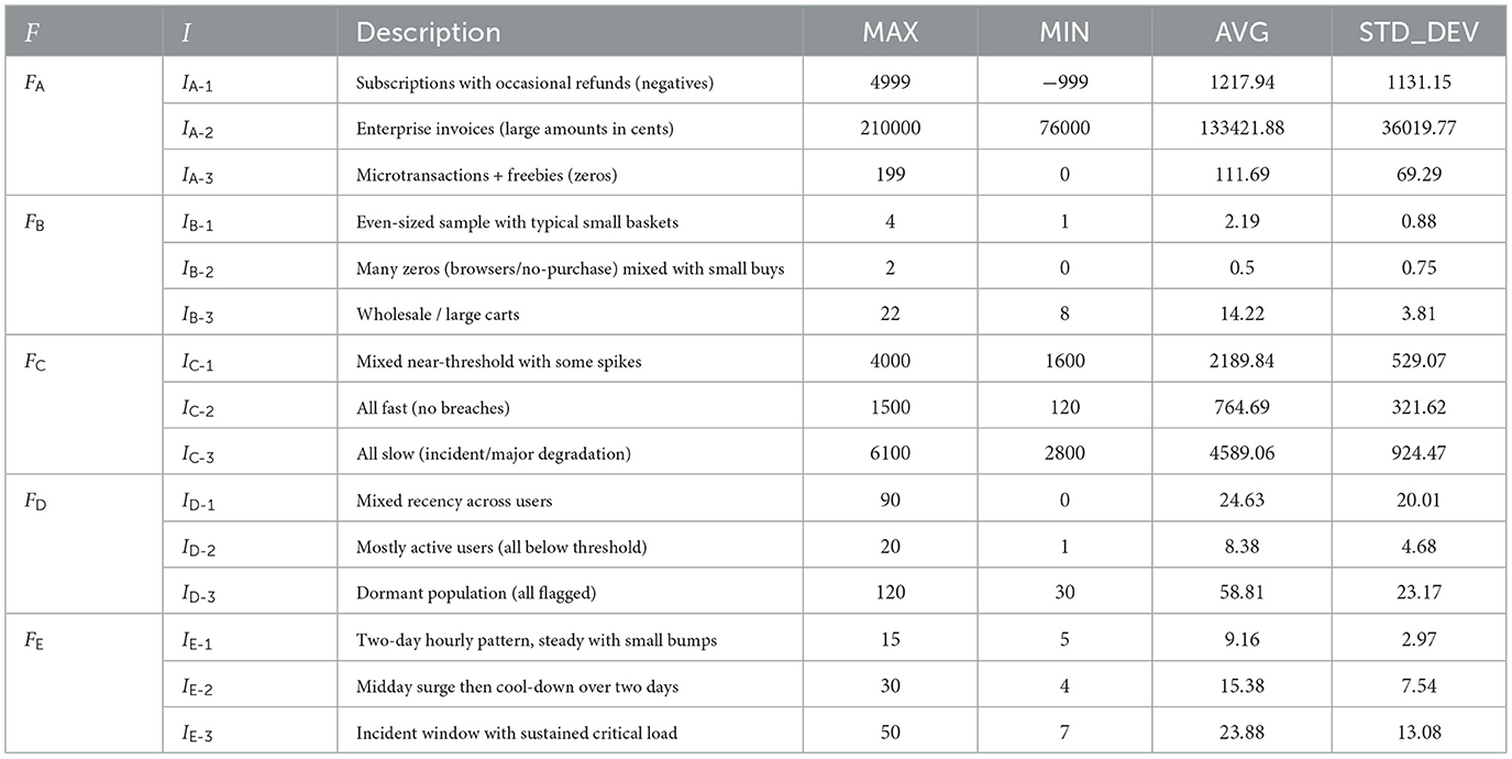 Table 2 summarizes the characteristics of each dataset used as input for each function. It contributes to understanding the range of values that each function handles and the differences across the cases analyzed. Specifically, for each array, the table reports the maximum value (column MAX), the minimum value (column MIN), the average (column AVG), and the standard deviation (column STD_DEV). These statistics provide insight into the variability and distribution of values within each dataset.