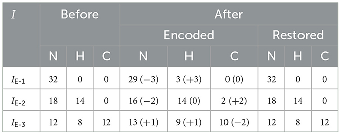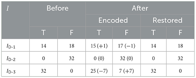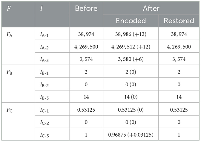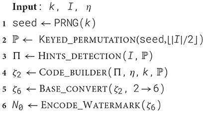 A more detailed description of the approach is provided below, outlining the procedures that define the watermark encoding and the controller. Algorithm 1 defines the watermark encoding, using as input the secret key k, the input set I, and the length of the secret code's binary notation ζ2 (denoted by η). First, it uses k to compute a seed utilizing a pseudo-random number generator implemented by the function PRNG(·) (see line 1). Then, the seed is used by the function KEYED_PERMUTATION(·) to produce a permutation of the ⌊|I|/2⌋ disjoint pairs in I, which determines the pair order for difference expansion (see line 2). The function returns the keyed deterministic permutation index list . The permutation is reproducible for the same inputs to KEYED_PERMUTATION(·), unpredictable without the seed, and aligns with deterministic pseudorandom function (PRF)-driven derivations in cryptographic standards (Barker and Kelsey, 2012; Pornin, 2013).