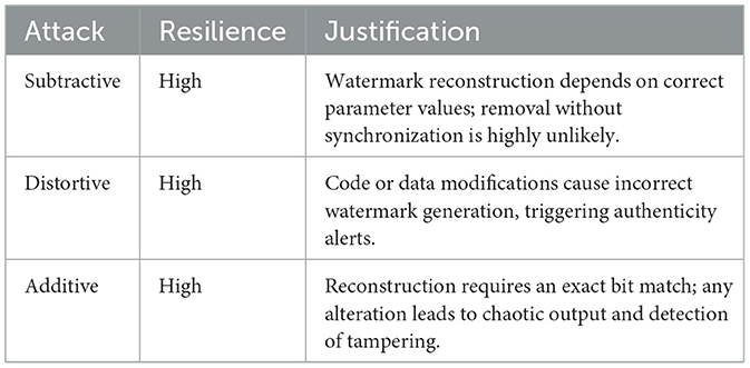 Despite the requirements, watermarking techniques must guarantee resilience against attacks aiming at removing the watermark to allow adversaries to claim software ownership or perform tampering without being noticed. According to the related literature, some of the more relevant attacks are Myles and Collberg (2006) and Dalla Preda and Ianni (2024):