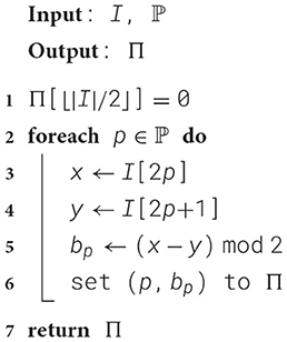 First, Π is allocated as an array of ⌊|I|/2⌋ bits with all entries initialized to 0 (see line 1). The number of elements in Π is defined by |I|, which denotes the cardinality of I. The symbols ⌊·⌋ denote the floor function, used in case I is composed of an odd number of elements. ℙ is utilized to partition I into adjacent pairs (x, y) = (I2p, I2p+1) (see lines 3 and 4). Scanning pairs in this order, we read the bit embedded by difference expansion and store it into bp (see line 5).7 Finally, the bit bp obtained for the current pair of values is added to the position indexed by p in Π (see line 6).