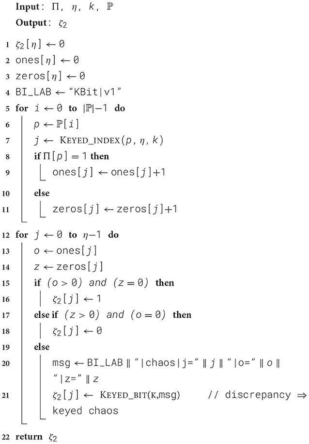 Consistency at position j is established by inspecting the tallies in ones and zeros for that index. If ones[j] > 0 and zeros[j] = 0, we set ζ2[j]←1 (see lines 15 and 16); if zeros[j] > 0 and ones[j] = 0, we set ζ2[j]←0 (see lines 17 and 18). Otherwise, either no votes (ones[j] = zeros[j] = 0) or a discrepancy (ones[j] > 0∧zeros[j] > 0), we treat the event as potential tampering and resolve it with a keyed tie-breaker KEYED_BIT(·) (see lines 20 and 21). This yields a deterministic, key-scoped bit that prevents chance agreement on manipulated inputs while remaining reproducible during verification. The generative key-based routines KEYED_PERMUTATION(·), KEYED_INDEX(·), and KEYED_BIT(·) are described in Section 4.5.