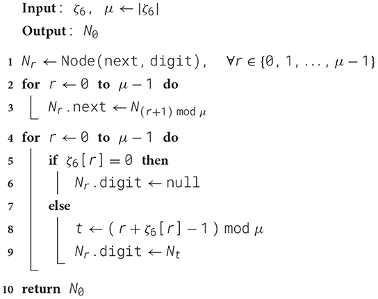 In the algorithm, all nodes are allocated with fields next, digit (see line 1). Next, the circular link between the nodes is created (see lines 2 and 3). Then, the values of the digit pointers are computed and assigned to each node depending on each value stored in each position of ζ6, according to the criteria previously described (see lines 4 to 9). Finally, the head node of the structure representing the watermark is returned (see line 10).