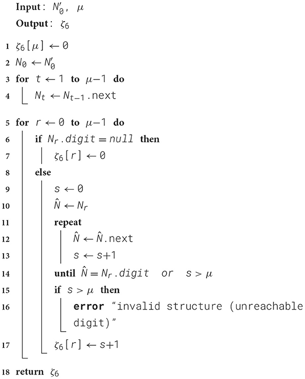 Next, the algorithm proceeds to decode each digit locally. For the position r, if Nr.digit = null then ζ6[r]←0 (see lines 6 and 7). Otherwise, it starts at Nr and advances along next, counting steps s until the digit target is reached, and returns ζ6[r]←s+1 (so 1= self, 2= next, 3= next-next, etc.) (see lines 9 to 17). The algorithm also uses a guard s > μ that flags an invalid structure (e.g., broken ring or unreachable digit) and prevents non-termination (see lines 15 and 16). Finally, after considering all nodes, if no error is reported, the recovered ζ6 is returned (see line 18).