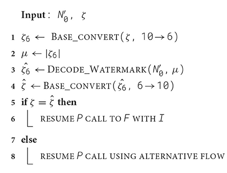 The entire watermark graph can be traversed from any head node. Given access to the first node, the decoder assumes the structure matches the circular list described above. Algorithm 5 describes the function DECODE_WATERMARK(·), used for the decodification. It takes as input a head node, denoted as (assumed to be the entry of the graph) and the length μ of the code expected to be extracted from the identified watermark. First, the function creates and initializes ζ6 as an array of μ items (see line 1). Then, it sets (see line 2). Next, it proceeds to create the circular list used to represent the graph. This is done by following next pointers for μ steps to collect the nodes in order from N0 to Nμ−1 (see lines 3 and 4). It is important to notice that the selection of only rotates the sequence and thus does not affect the recovered digits.