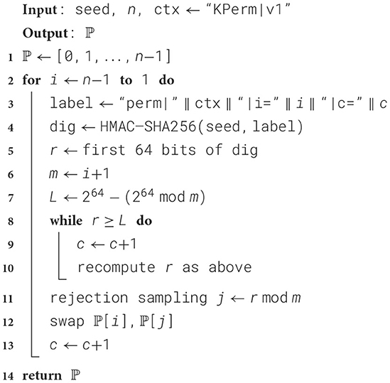Algorithm 7 specifies the procedure for KEYED_PERMUTATION(·). Its inputs are a secret seed, a pair-count n, and an optional context string ctx for domain separation. If ctx is omitted, a default value is used. The function initializes ℙ as the identity ordering [0, 1, …, n−1] (line 1) and applies the Durstenfeld/Knuth Fisher-Yates shuffle from i = n−1 down to 1 (line 2). At each iteration, it derives a swap index j ∈ 0, …, i via a keyed PRF. Specifically, it builds a domain-separated label from ctx and loop metadata (i, c) (see line 3), computes a hash-based message authentication code (HMAC) using the cryptographic hash function SHA-256 (see line 4), extracts the first 64 bits as an integer r (see line 5), and maps r uniformly to [0, i] via rejection sampling with modulus m = i+1 and cutoff L = 264−(264 mod m) (see lines 6 and 7). If r, the counter c is incremented and r re-derived until valid (see lines 8 to 10). The swap index is then set as j = r mod m (line 11), and ℙ[i] is exchanged with ℙ[j] (see line 12). The counter c advances once per iteration to decorrelate labels (see line 13).
