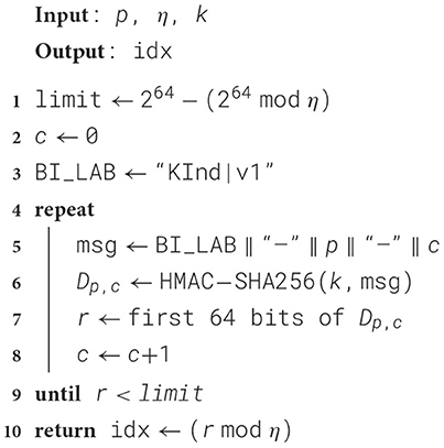 In detail, Algorithm 8 begins by computing the cutoff limit = 264−(264 mod η) (see line 1), ensuring unbiased indices through rejection sampling, as also applied in KEYED_PERMUTATION(·). It then initializes the counter c and the fixed domain label BI_LAB (see lines 2 and 3). Each iteration constructs a message msg, computes an HMAC–SHA256 digest Dp, c using msg and k, and interprets the first 64 bits as an integer r (see lines 5 to 7). The counter c is incremented until a valid r<limit is obtained (see lines 8 and 9). Finally, the algorithm outputs idx←r mod η (see line 10). In this way, each position p in a permutation is deterministically associated with a particular index in ζ2.
