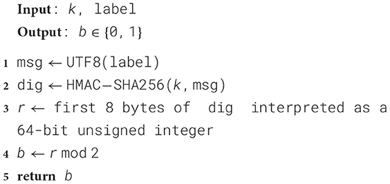 Algorithm 9 specifies the implementation of KEYED_BIT(·). It first encodes the domain-separated label into bytes (UTF-8) (see line 1) and computes an HMAC–SHA256 digest with k over that byte string (see line 2). Then, it interprets the first 64 bits of the digest as an unsigned integer r (see line 3) and outputs b←r mod 2 (see line 4). Since 2 divides 264 evenly, this reduction is unbiased and requires no rejection sampling. Finally, the algorithm returns b (see line 5). For generating wider indices in [0, m) with arbitrary m, a companion routine employing rejection sampling must be used to avoid modulo bias.