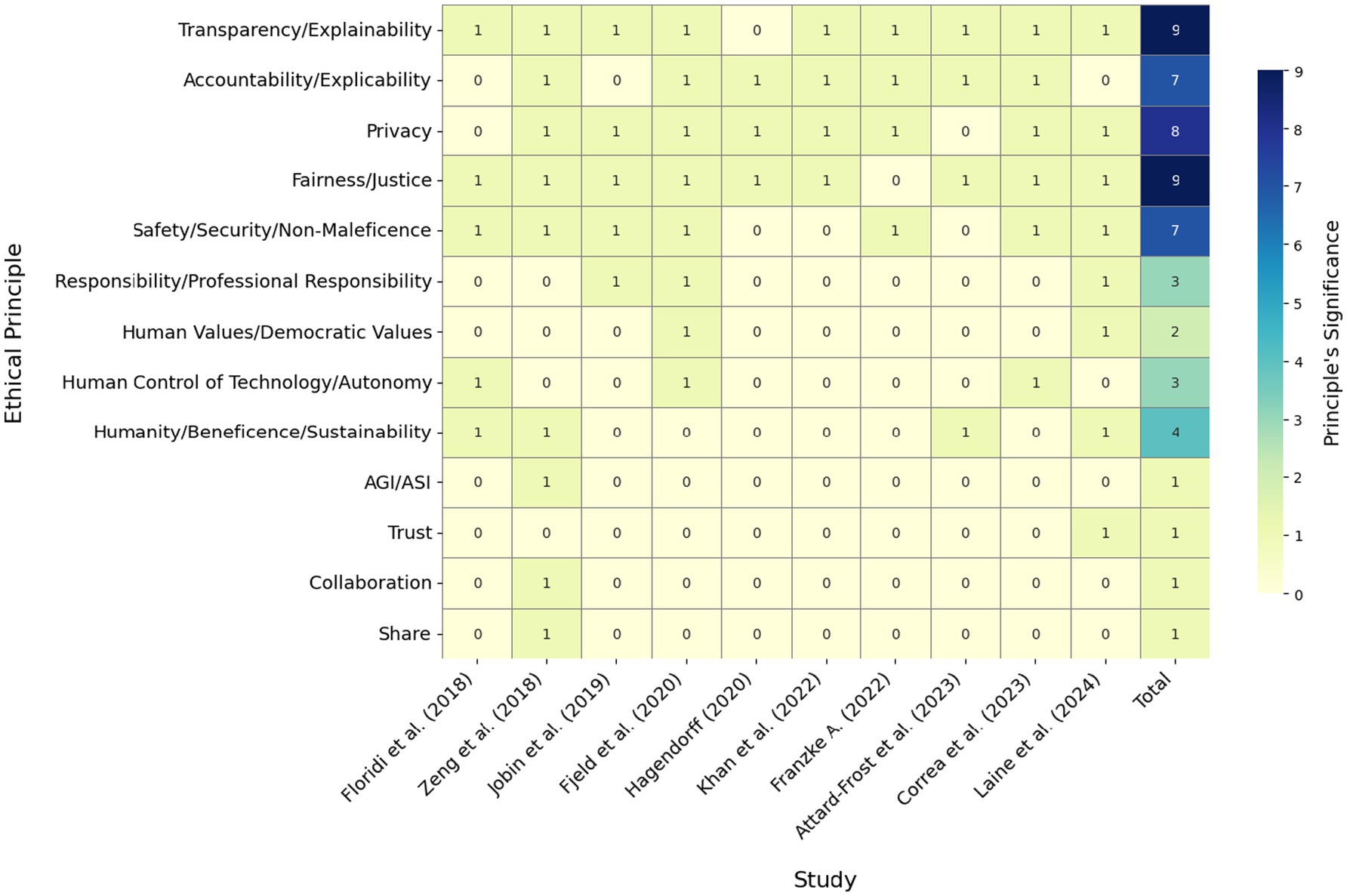 In the current decade, Fjeld et al. (2020) analyzed the content of 36 prominent AI principles documents to identify trends and essential components in the discussion on the future of AI technologies. They established 47 principles governing the AI, which can be categorized into eight themes: Accountability, Privacy, Fairness & Nondiscrimination, Safety & Security, Transparency & Explainability, Human Control of Technology, Professional Responsibility, Promotion of Human Values. They also point out that the aforementioned themes serve as fundamental requirements, expressing the importance of these conceptual and ethical principles. Hagendorff (2020) conducted a semi-systematic literature review that compares 22 guidelines, finding that principles of Accountability, Fairness, and Privacy appear altogether in about 80% of all guidelines and identifying 22 ethical principles in total. He also notes that these three core aspects constitute of minimum requirements for building and using AI systems ethically. Franzke (2022) conducted research on a total of 70 AI ethics guidelines. The analysis concluded that the most dominant principles are Transparency, Privacy, and Accountability. She notes that AI ethics guidelines largely ignore the crucial question of how ethical principles can be transposed onto the usage of technology. Furthermore, Khan et al. (2022) presented a systematic literature review revealing a global convergence around 22 ethical principles. Through their approach, Transparency, Privacy, Accountability, and Fairness are identified as the most common AI ethics principles. They highlight the existence of significant practical challenges involved in implementing the guidelines in real-world conditions, mentioning the lack of tools or frameworks that bridge the gap between principles and practice. Attard-Frost et al. (2023) concentrate on four a priori principles, which they have designated F.A.S.T., examining 47 AI ethics guidelines. These principles are Fairness, Accountability, Sustainability, and Transparency. Corrêa et al. (2023) took into account 200 AI guidelines, identifying 17 principles prevalent in the respective policies and guidelines. From those principles, the top five, based on citation index, were found to be similar to the ones identified by Jobin et al. (2019) and Fjeld et al. (2020). Laine et al. (2024) conducted a systematic literature review to understand ethical principles and stakeholders in ethics-based AI auditing. From the sample of 110 studies, they conducted backward citation chaining. Finally, they assessed 93 articles on ethics-based AI auditing. The results were the grouping of 54 terms related to ethics into eight principles: Justice & Fairness, Transparency, Non-Maleficence, Responsibility, Privacy, Trust, Beneficence, Freedom & Autonomy. The authors enriched the results of the systematic literature review by adding three additional principles, namely Sustainability, Dignity, and Solidarity, in order to enhance comprehensiveness, even though none of the studies explicitly mentioned them. Table 1 presents the results of the systematic literature reviews, while Figure 1 presents the outcomes of the meta-analysis.