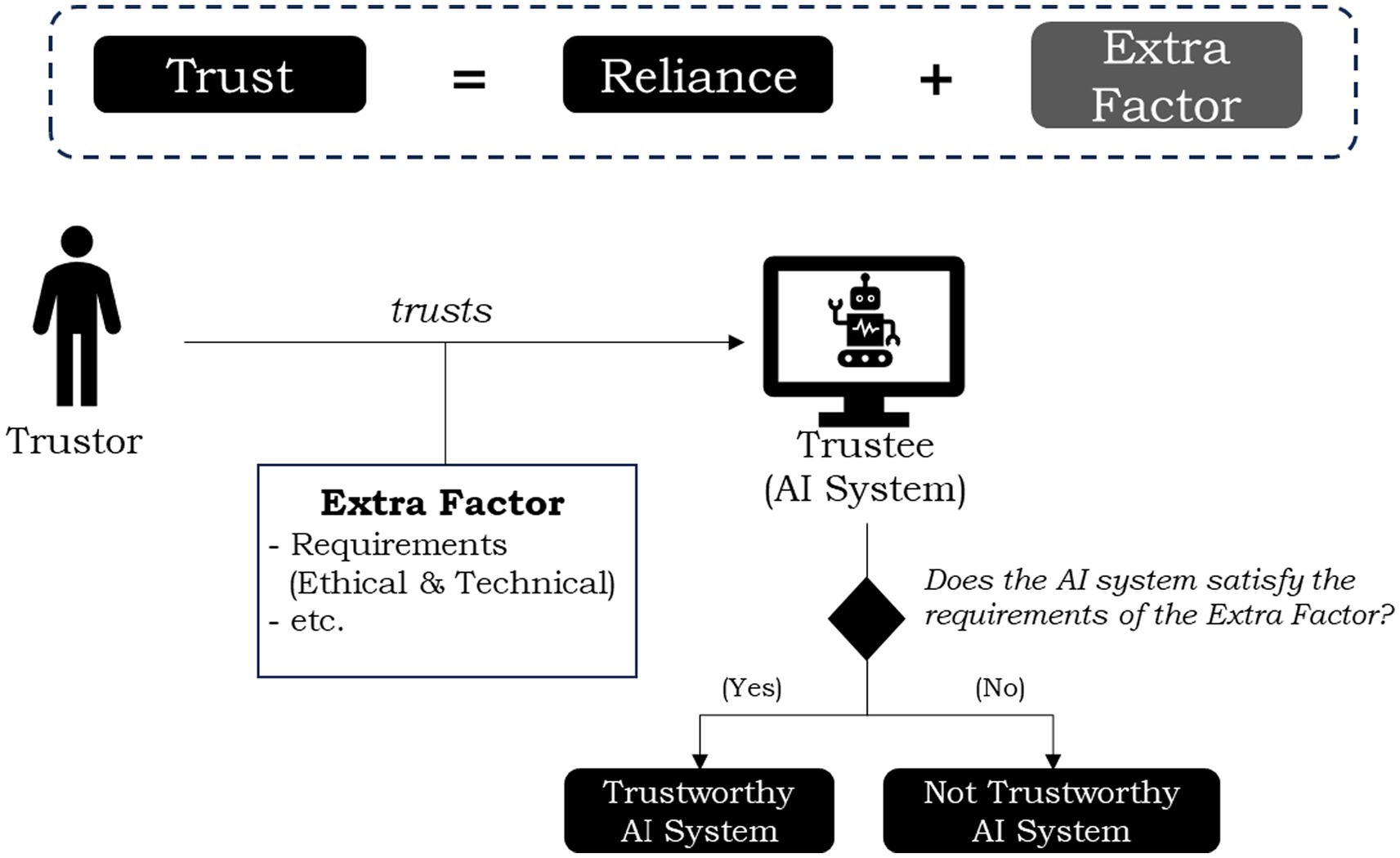 While these definitions are contextually appropriate, they often rely, implicitly or explicitly, on a philosophical core. Both phenomena are associated with a certain degree of expectation, vulnerability, and moral hope. These concepts are examined in greater detail in philosophical discourse. The Oxford Dictionary of Philosophy defines trust as “the attitude of expecting good performance from another party” (Blackburn, 2016), tying it closely to values like loyalty, truthfulness, and promise-keeping. Philosophically, trust can be understood as the confidence one entity has in another that the latter will behave as expected. It is necessary to point out that trust is an attitude that we have towards entities in which there is the hope that they will be trustworthy, where trustworthiness is a property and not an attitude (McLeod et al., 2023). Trust involves a form of reliance, but it goes beyond simple dependence, including some extra factor (Hawley, 2014; Durán and Pozzi, 2025; Simion and Kelp, 2023). This extra factor generally concerns why the trustor (i.e., the one who trusts) would rely on the trustee (i.e., the one who is trusted) to be willing to carry out the actions for which they have been trusted.