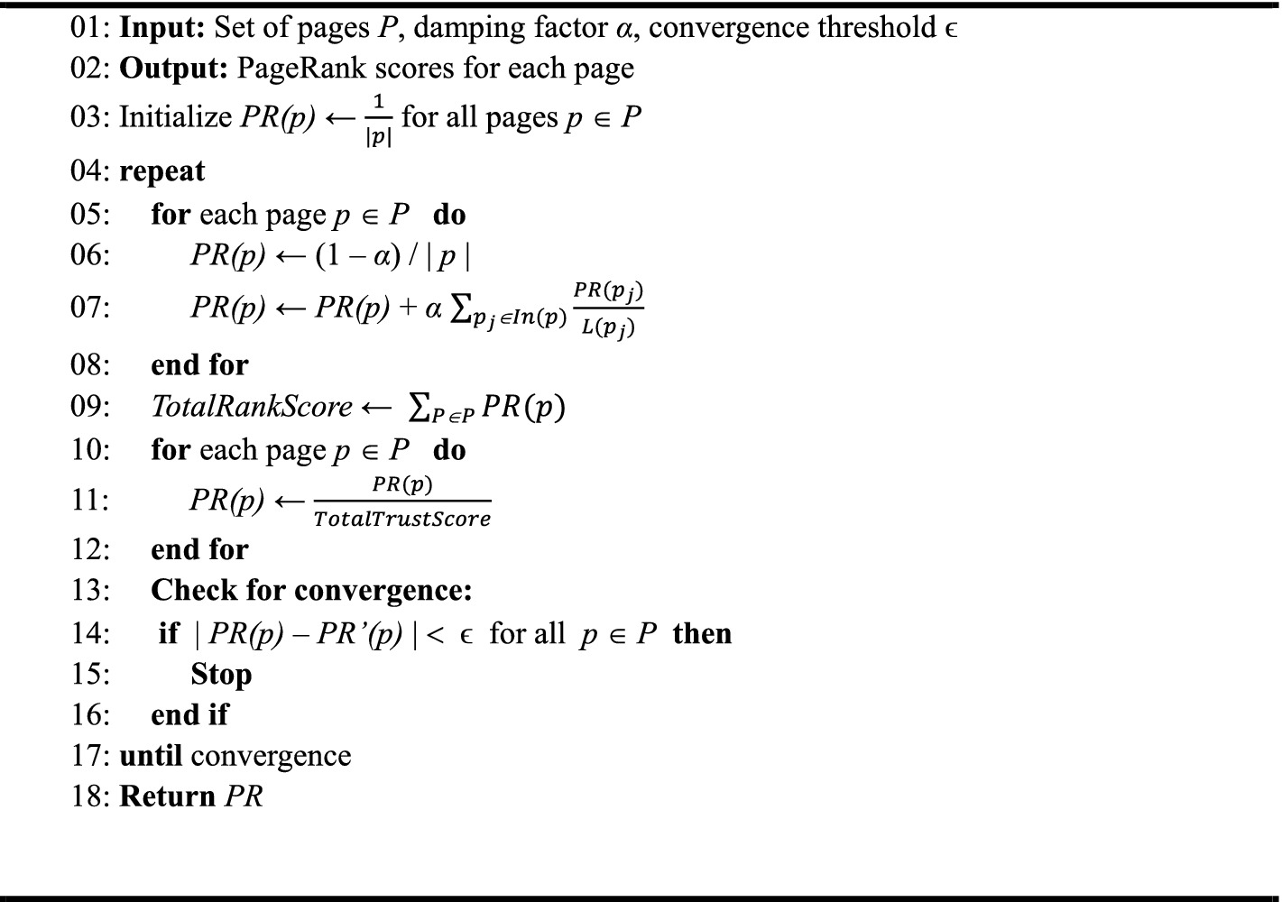 After describing the algorithms, it is equally essential to consider the algorithmic process of these methods. In Algorithm 1, we describe the stages of PageRank, with inputs being the set of pages (P), the damping factor (α), and the convergence threshold (ϵ). The damping factor prevents the algorithm from getting stuck in infinite loops. The intuition behind this factor is that a higher value means more weight to the link structure, while a lower value gives more weight to random jumps. Also, the factor is typically set to 0.85 (Brin and Page, 1998), meaning there is an 85% chance the user will continue clicking on links and a 15% chance they will stop and start over from a random page, ensuring that the PageRank values converge. The convergence threshold determines the level of accuracy required, with a smaller threshold meaning more precise calculations, but longer computational time.