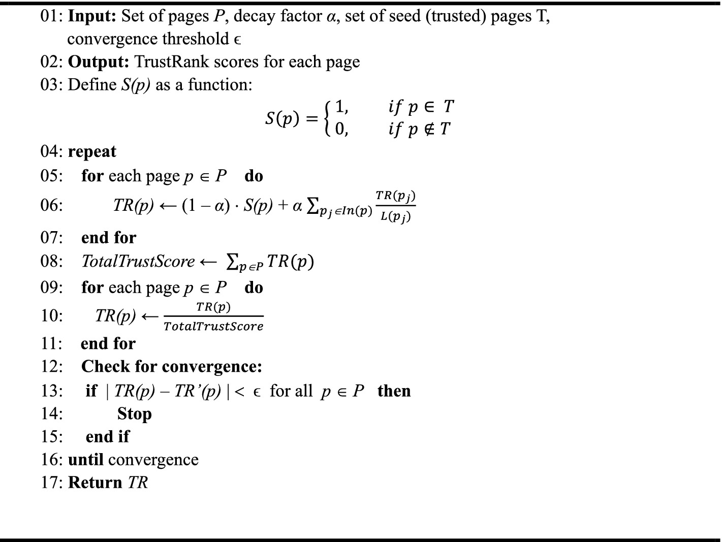 TrustRank, as an extension of PageRank, generally has a similar structure. Noteworthy is that the intuition behind the decay factor (α) indicates that a higher value of the factor gives more weight to the link structure, while a lower value gives more weight to the initial trust assigned to seed pages. Furthermore, Algorithm 2 illustrates the phases of TrustRank.