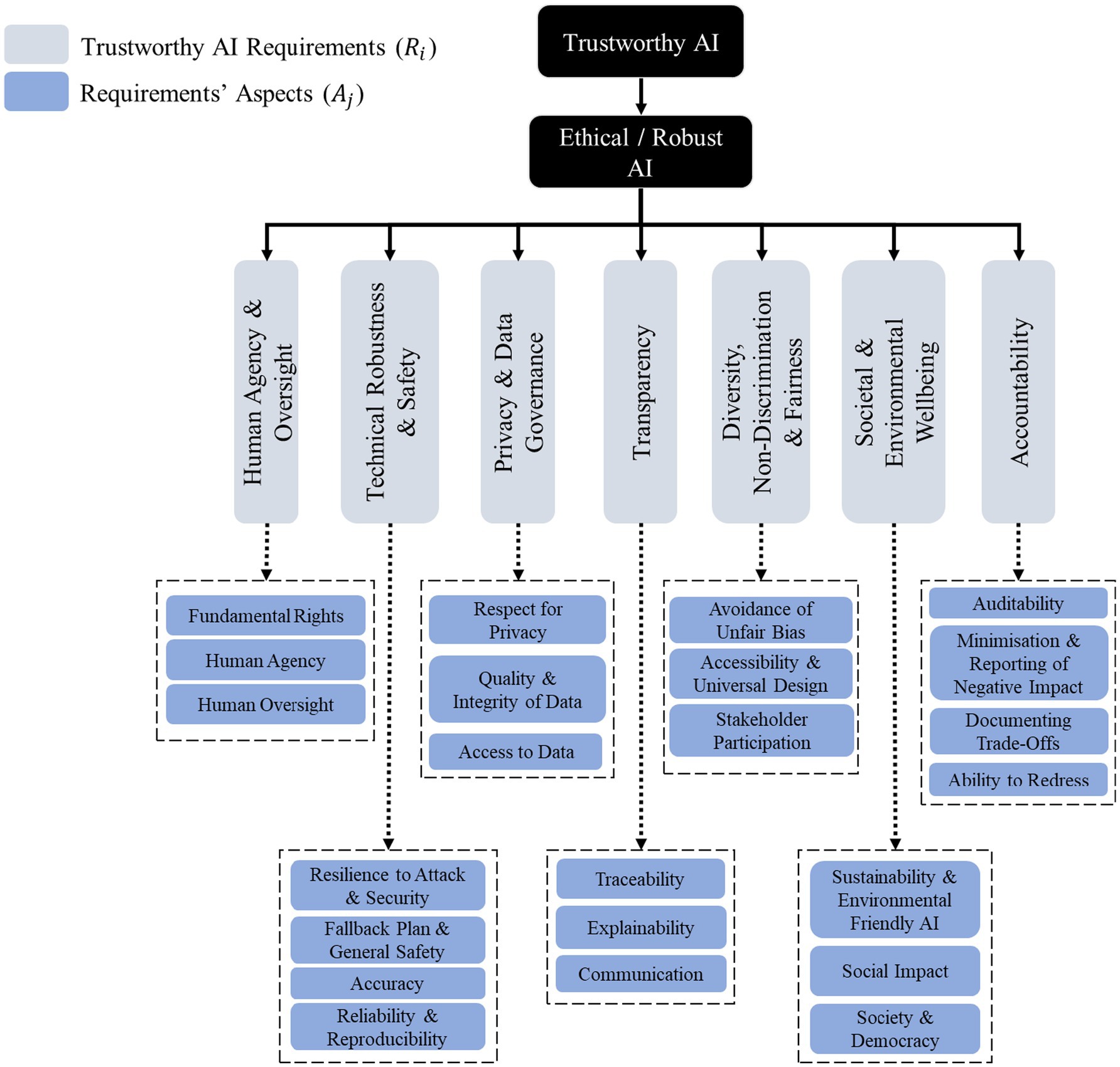 Before assessing the trustworthiness of an AI system, it is essential to understand its architecture and components. The components of an AI system may vary depending on the organization that develops it, as well as the nature of the application and its intended use. Although there are shared conceptual foundations across different AI systems, it is important to note that each organization delineates the components and structures of the software it aims to develop in distinct ways. The proposed algorithmic approach assumes that the reliance relationships between the software components and the trustworthiness requirements of the relevant framework, in this case, the ALTAI, have already been defined. We propose applying Link Analysis algorithms to assess the trustworthiness of AI system components. By assessing these components, the overall trustworthiness of the AI system, concerning specific requirements, could be determined. The proposed methodological approach enables the investigation of the propagation of trustworthiness within the system and the dependency relationships between system components in terms of trustworthiness. As the conceptual foundation for our approach, we adopted the ALTAI schema, which represents a synthesis of the meta-analysis presented in Section 2, as it closely aligns with the content and findings of that analysis. Figure 3 shows the Trustworthy AI requirements and aspects of each, as described by the AI HLEG (European Commission, Directorate-General for Communications Networks, Content and Technology, 2020; High-Level Expert Group on Artificial Intelligence, 2019). These requirements and aspects serve as part of the elements of the graph-based algorithmic approach presented in what follows.