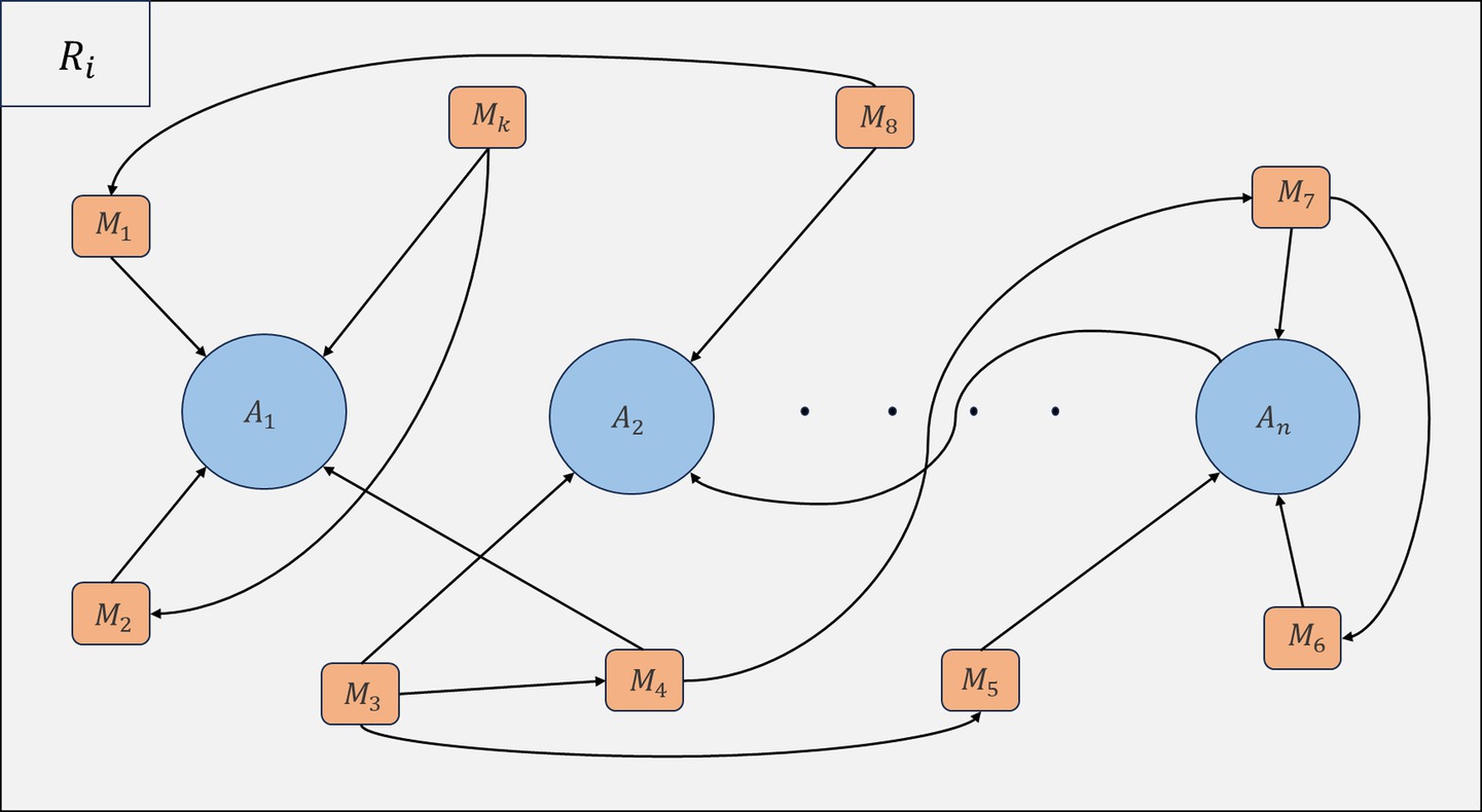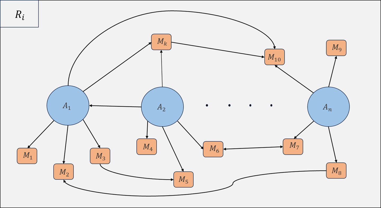 The components of an AI system can be derived from its structure and linked to data, user input, and system outputs (OECD, 2024; European Commission, 2021). Additionally, the user interaction environment and the environments affected by the system (virtual or physical) can serve as sources for identifying various components related to the requirements for Trustworthy AI. Therefore, each aspect of every trustworthiness requirement is assumed to be associated with certain components of the AI system. Based on this logic, we construct a directed graph that links each aspect (j = 1,…,n) of every trustworthiness requirement (i = 1,…,m) to the relevant components (w = 1,…,k) of the AI system. We also note that there may be interconnections between aspects and components themselves. Figure 4 presents an overview of the structural organization of the graph representing our hypothetical system. It illustrates the connections within the scope of a Trustworthy AI requirement . It is evident that the depth of the system representation can be configured to encompass multiple levels. It is proposed to adopt a two-level depth representation, comprising the following categories/entities: